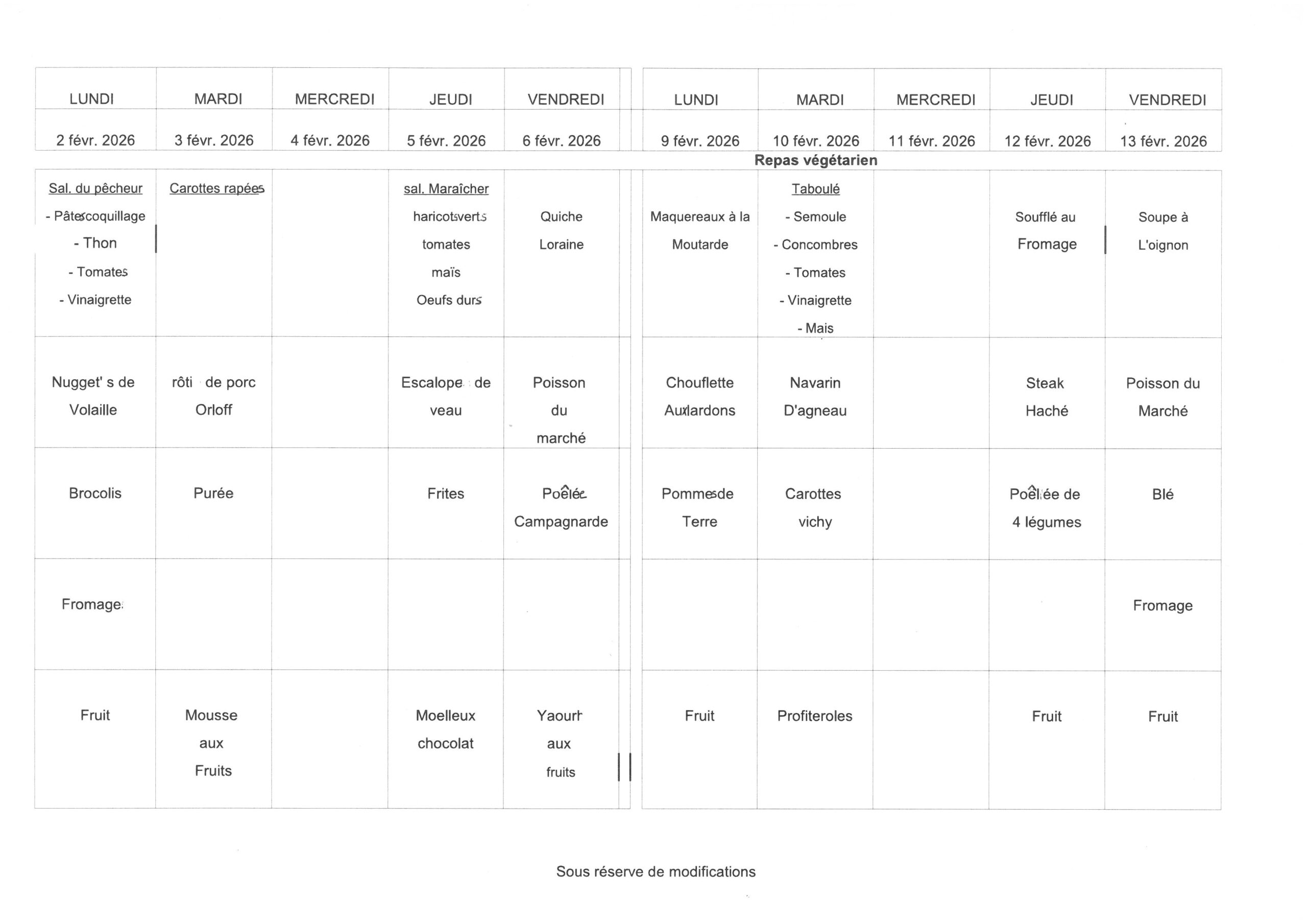 Voici les menus de la cantine